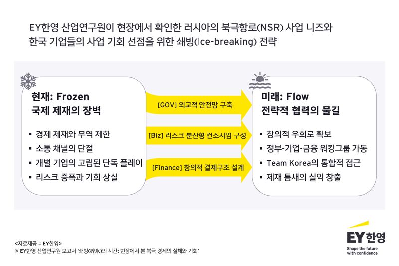 권영대 EY한영 산업연구원장은 “현재 굳게 닫힌 러시아와의 비즈니스 재개를 위해서는, 양국의 상호 이익을 공유할 수 있는 유연하고 창의적인 사업 구조 설계와 이를 논의할 수 있는 지속적인 소통 채널 확보가 무엇보다 중요하다”며 “단발성 시도를 넘어 민관이 하나로 움직이는 ‘팀 코리아’의 통합된 역량을 통해 다가올 북극 시대의 기회를 선제적으로 준비한다면, 퍼스트 무버로서의 시장 주도권과 제도적 혜택을 선점할 수 있을 것”이라고 강조했다.