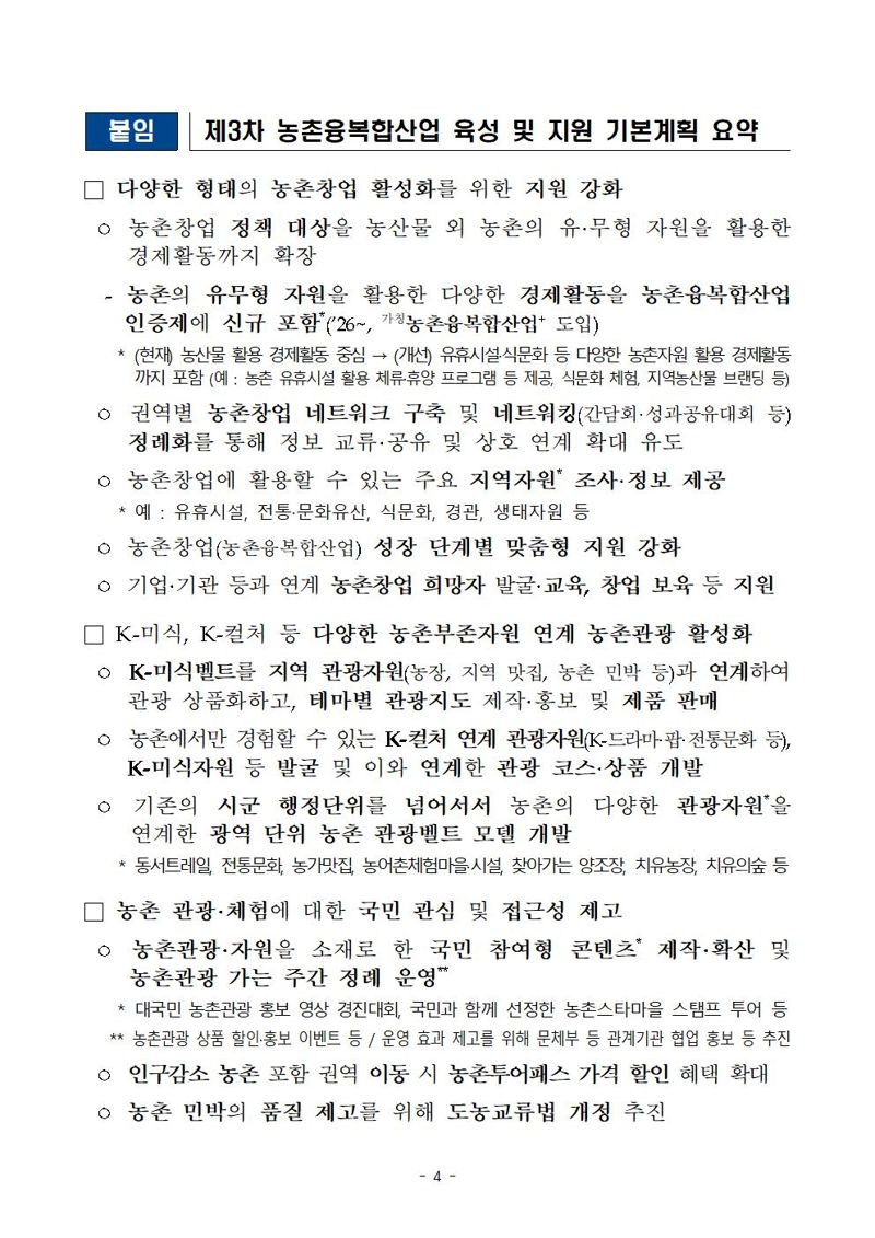 농식품부 박성우 농촌정책국장은 “이번 제3차 농촌융복합산업 육성 및 지원 기본계획의 중점 과제들을 적극적으로 이행해 실질적인 성과가 창출될 수 있도록 하고, 향후 농촌창업 지원체계 고도화 등 정책 발전을 위한 노력도 지속해 나갈 계획이다”고 말했다.