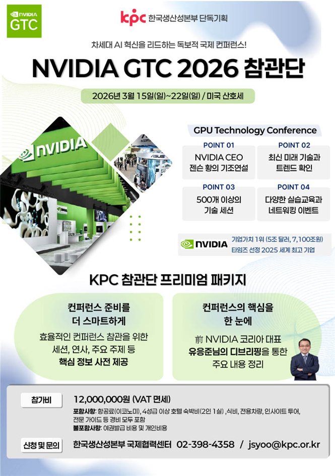 KPC는 조직의 리더십, 전략, 성과를 고도화시키기 위한 글로벌 혁신 현장을 직접 체험하는 해외연수 프로그램을 다년간 운영 중이다. 올해는 미국, 중국, 유럽 등 세계 각지의 혁신 기업 탐방과 주요 박람회 참관단 등을 모집할 예정이다. GTC 2026 참관단을 비롯한 자세한 사항은 KPC 국제협력센터에서 문의할 수 있다.