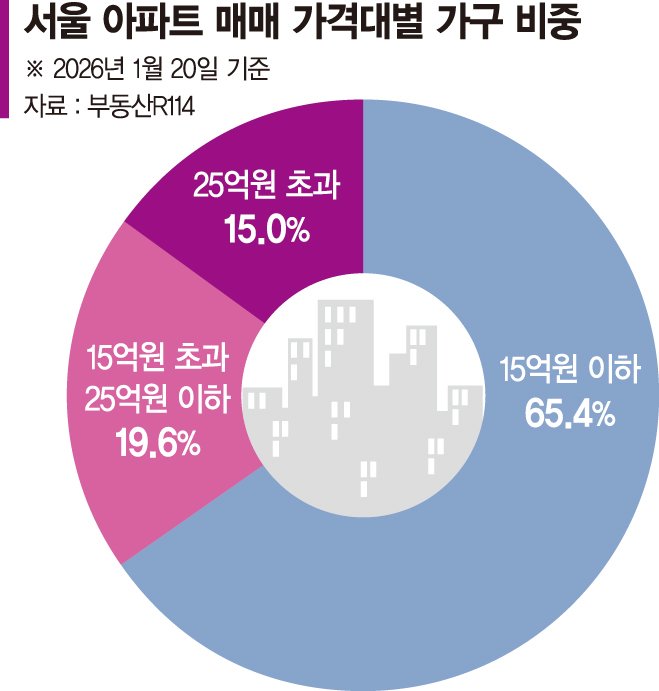 20일 파이낸셜뉴스가 부동산R114에 의뢰해 분석한 결과, 지난해 서울 아파트 중 15억원을 초과한 아파트는 전체의 34.6%로 나타났다. 가격별 아파트 비중은 △15억원 이하 65.4% △15억원 초과~25억원 이하 19.6% △25억원 초과 15.0%였다.