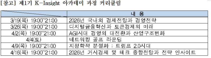 교육 과정은 △국내외 경제 전망과 기업 전략 △디지털 금융 및 토큰경제의 재무적 영향 △인공지능(AI) 및 범용 인공지능(AGI) 시대의 산업 구조 변화 △지정학 리스크와 기업의 사업 전략 등 네 가지 핵심 아젠다로 구성된다.