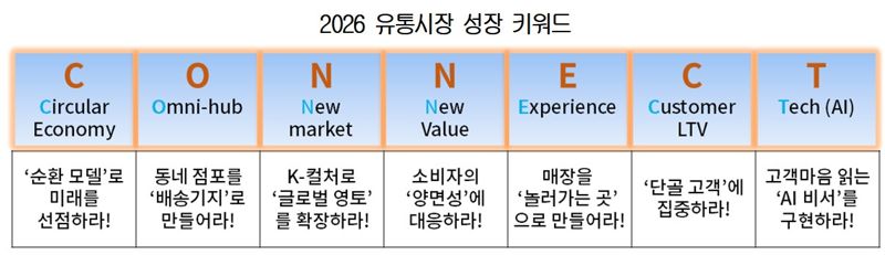 대한상의는 21일 발간한 '2026 유통시장 소비 트렌드' 보고서에서 올해 유통산업의 키워드로 '연결(C.O.N.N.E.C.T)'을 지목했다.