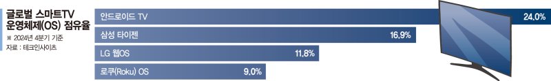 21일 업계에 따르면 시장조사기관 테크인사이츠에 따르면 지난 2024년 4·4분기 기준, 글로벌 스마트TV OS 시장에서 삼성 타이젠은 16.9%, LG 웹OS는 11.8%의 점유율을 기록했다. 양사 합산 점유율은 28%를 넘어 구글 안드로이드TV의 점유율(24%)을 소폭 앞선 것으로 나타났다.