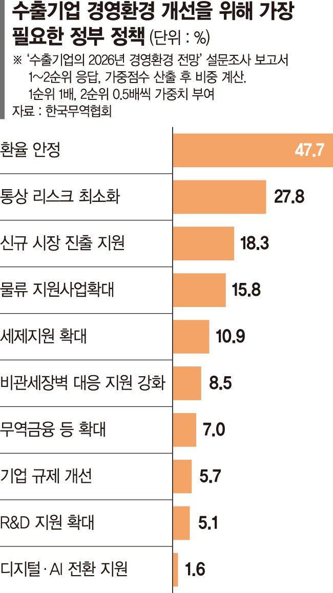 21일 한국무역협회 국제무역통상연구원이 발간한 '수출기업의 2026년 경영환경 전망' 설문조사 보고서에 따르면 국내 기업들이 꼽은 올해 가장 큰 대외 리스크는 미국 관세(40.1%)가 아닌 환율 변동성 확대(43.5%)로 조사됐다. 응답기업 다수는 환율 상승이 초래한 △해외 바이어의 단가인하 요구 △수입 원자재 가격 인상 △국내 물가 상승 등을 주요 부담요인으로 꼽았다.