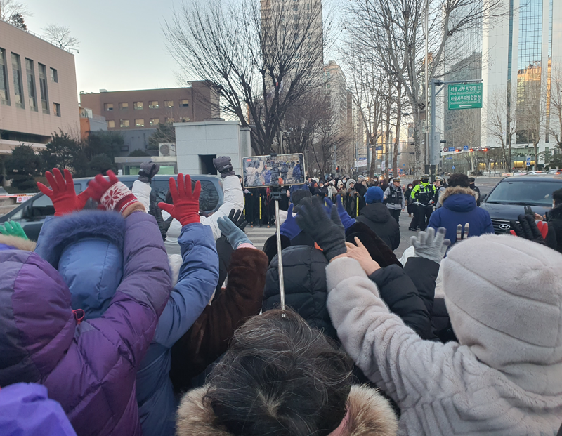 이날 전 목사의 검찰 송치 소식이 전해지자 지지자 100여명은 서부지검 앞에 모였다. 이들은 전 목사가 탄 차량이 검찰청으로 진입하자 손을 흔들며 전 목사의 이름을 연호했다. 이날 오전 기온은 영하 13도까지 내려갔다.