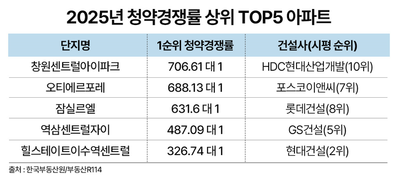 22일 부동산R114가 한국부동산원 청약홈 데이터를 분석한 결과, 2025년 전국 아파트 청약 경쟁률(1순위 기준) 상위 5개 단지는 모두 시공능력평가 10위 내 1군 건설사의 브랜드 아파트로 나타났다. 최고 경쟁률은 경남 창원의 '창원센트럴아이파크'가 706.61대 1로 기록했다. 이어 △서울 성동구 '오티에르포레'(688.13대 1) △송파구 '잠실르엘'(631.60대 1) △강남구 '역삼센트럴자이'(487.09대 1) △동작구 '힐스테이트이수역센트럴'(326.74대 1) 순이었다.