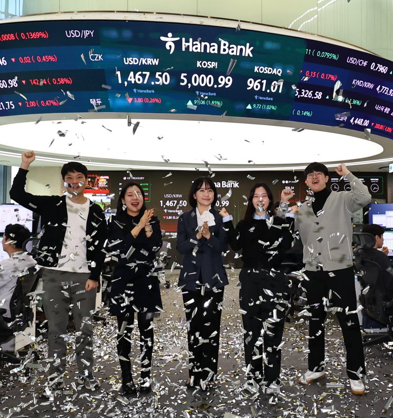 [서울=뉴시스]남주현 기자 = 코스피가 장중 사상 처음으로 5000선을 밟은 가운데 원·달러가 이틀째 하락세를 이어가고 있다.