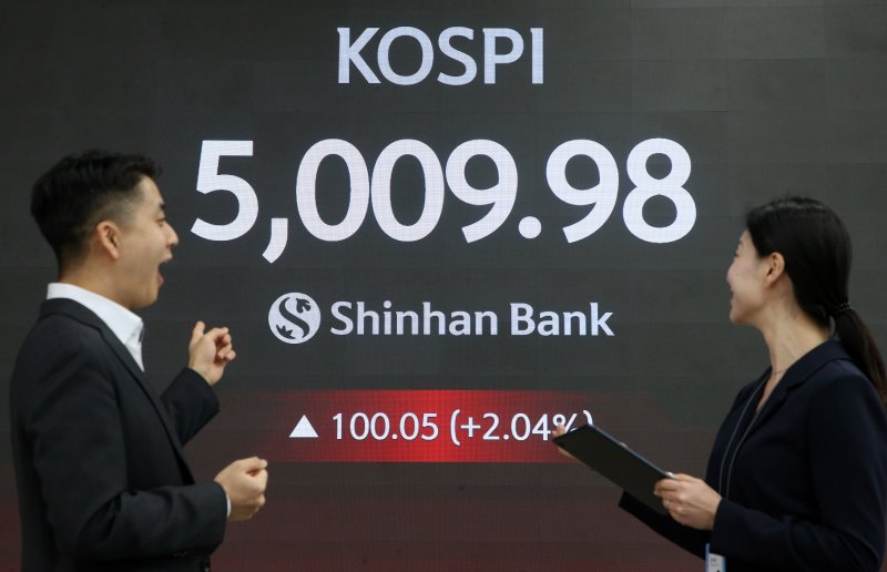이날 코스피는 77.13p(1.57%) 상승한 4987.06에 거래를 시작한 뒤 상승폭을 키우며 5000선에 진입했다. 장 한때 5019.54까지 치솟았지만, 외국인의 매도세에 상승분을 일부 반납한 모습이다.