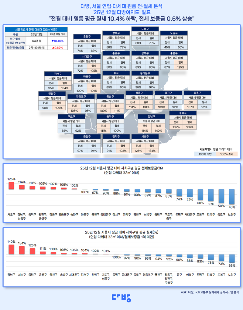 다방은 이번 '12월 다방여지도'에서 전월세 전환율을 반영해 보증금 1000만 원 기준 평균 월세와 평균 전세 보증금을 산출했다. 평균 월세는 월세 보증금 1억 원 미만 거래를, 평균 전세 보증금은 전체 전세 거래를 기준으로 집계했다. 이번 조사는 서울 내 전용면적 33㎡ 이하 연립∙다세대 원룸을 대상으로 했으며, 자치구별 시세 차이를 한눈에 확인할 수 있도록 구성됐다.