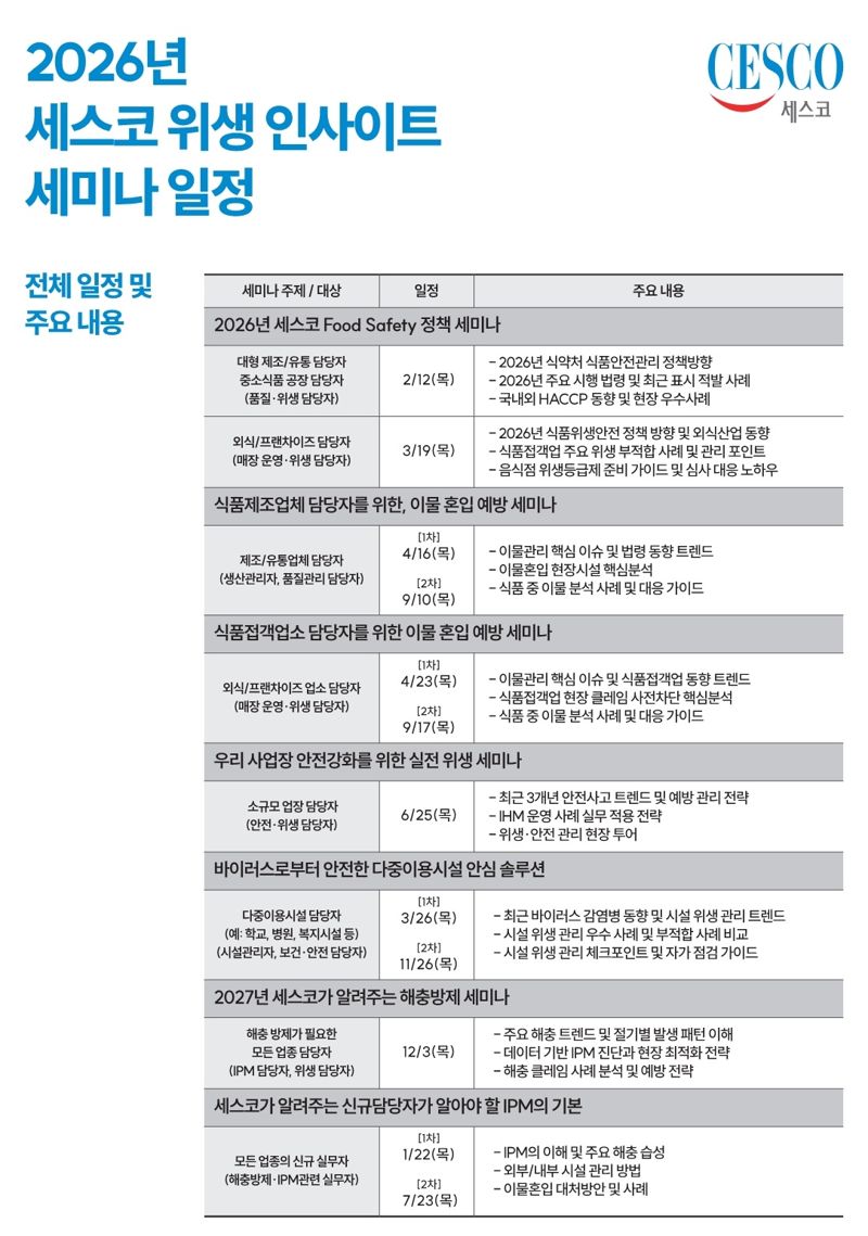 세스코는 △식품안전 정책 변화와 현장 대응 전략을 다루는 Food Safety(식품안전) 정책 세미나(2월) △식품 제조·가공 현장의 이물 혼입 예방과 관리 기준을 제시하는 이물 혼입 예방 세미나(4·9월) △사업장 안전과 위생관리 체계를 점검하는 산업 위생 세미나 (6월) △다중이용시설을 중심으로 한 바이러스 감염 대응 세미나(3·11월) △해충 발생 양상과 2027년 대응 전략을 정리하는 해충방제 세미나(12월) 등 환경위생 주요 이슈를 주제로 세미나를 이어갈 계획이다.