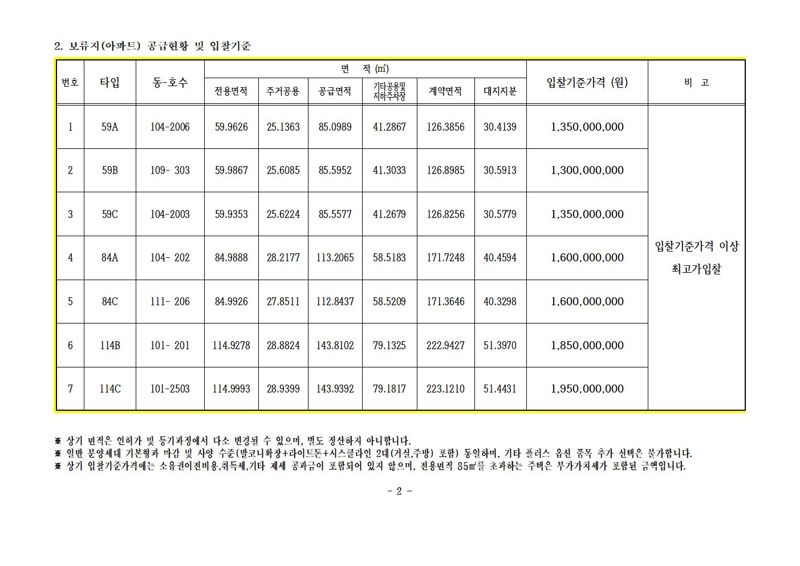 전용면적 59㎡는 3가구로, 입찰기준가격은 13억5000만원이다. 이른바 '국민평형'인 84㎡는 2가구이며 16억원이다. 114㎡는 B타입과 C타입이 한 가구씩 나왔으며, 입찰기준가격은 각 18억5000만원과 19억5000만원이다. 최고가를 써낸 응찰자가 소유권을 거머쥐게 된다.앞서 조합은 지난 2024년 9월에도 보류지 16가구를 매각한 바 있다. 당시 입찰기준가격은 △59㎡(15가구) 8억3300만원~9억8000만원 △114㎡(1가구) 13억4000만원이었다.