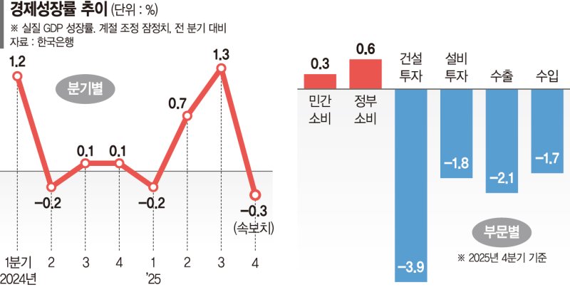 건설투자는 부진했다. 건물건설, 토목건설이 동시에 줄어 전기 대비 3.9% 감소했다. 2024년 4·4분기(-4.1%) 이후 최저치다. 전년 동기 대비로는 7.4% 주저앉았다. 설비투자는 운송장비(자동차 등) 중심으로 1.8% 줄었다. 전년 동기와 비교해도 1.7% 빠졌다. 두 부문의 기여도는 각각 -0.5%p, -0.2%p였다.