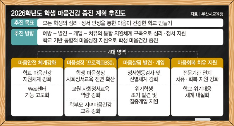 모든 학생을 대상으로 한 예방 중심의 사회정서교육인 '마음성장 프로젝트 B30'을 통해 교육과정과 연계한 마음건강 지원을 확대한다. 시교육청은 교육과정 기반 부산형 사회정서교육 자료를 개발·보급해 학교급별 특성에 맞는 체계적인 사회정서교육이 현장에서 운영되도록 지원키로 했다.
