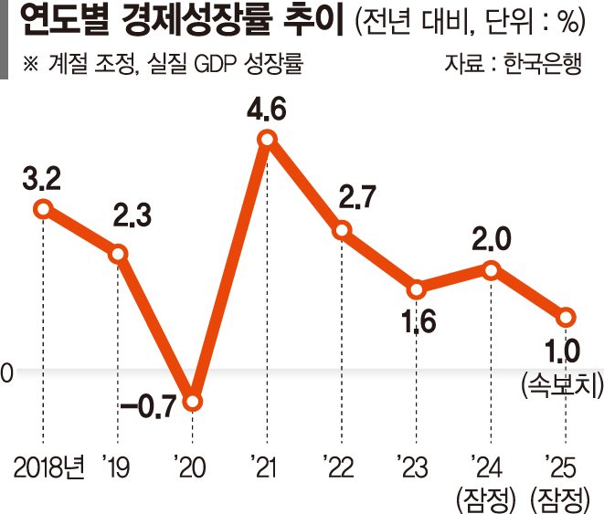 22일 한은에 따르면 2025년 우리나라의 실질 국내총생산(GDP) 성장률은 1.0%로 집계됐다. 지난해 11월 한은 금융통화위원회 전망치와 같다. 이동원 한은 경제통계2국장은 "지난해 1·4분기에는 정치적 불확실성 등으로 역성장(-0.2%)이 나타나기도 했지만 이후 (경제가) 예상보다 빨리 회복되는 모습을 보이면서 전망치를 상향 수정해왔다"며 "4·4분기 마이너스 성장이었음에도 연간 성장률이 1.0%를 기록한 것은 유의미하다"고 전했다.