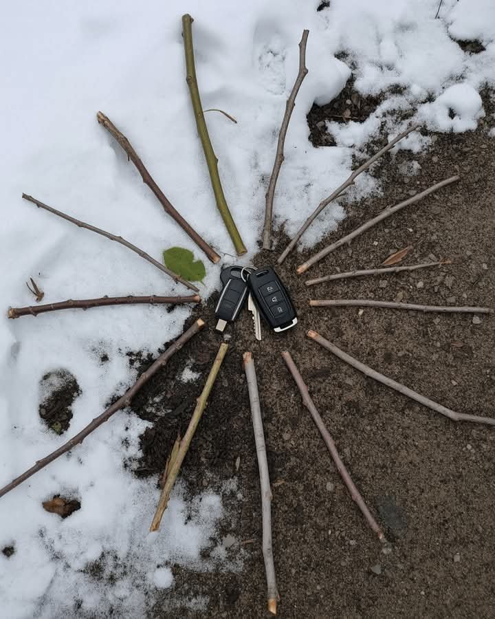 지난 21일 X(옛 트위터)에는 눈이 쌓인 길 위에 떨어진 자동차 키 주변을 잔가지로 둥글게 둘러놓은 사진이 게시됐다. 키가 눈에 묻히거나 지나치기 쉽지 않도록, 마치 작은 울타리처럼 눈에 띄게 표시해 둔 모습이다.