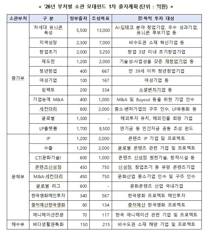 중소벤처기업부는 문화체육관광부, 해양수산부, 한국벤처투자와 '모태펀드 2026년 1차 정시 출자 공고'를 통해 이 같은 내용을 23일 발표했다.