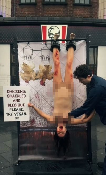 거꾸로 매달린 여성의 옆에는 '닭이 쇠사슬에 묶여 피를 흘리며 죽임을 당했다, 비건 음식을 시도해 보라(Chickens: Shackled and bled out. Please, try vegan)'는 문구의 팻말이 세워져 있다.