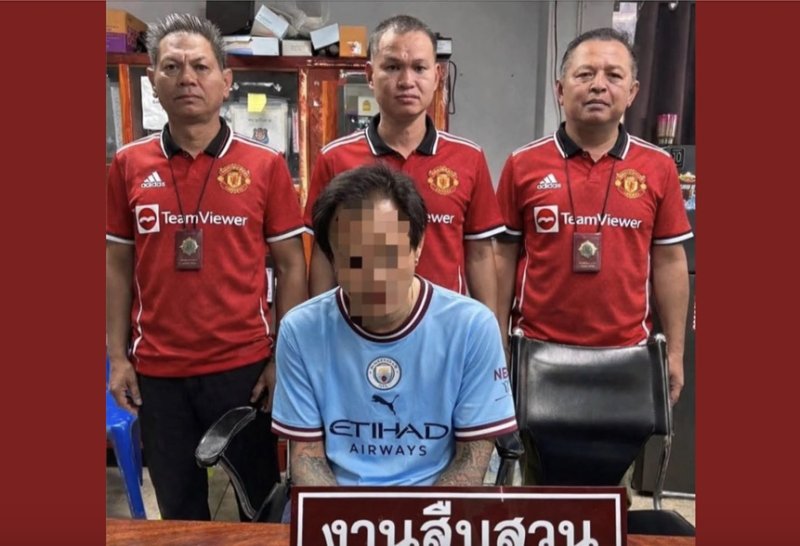 21일(현지시간) 영국 매체 더선 등 외신에 따르면, 태국 북동부 데추 우돔 지역 경찰은 최근 필로폰 소지 혐의로 43세 남성을 체포했다. 화제가 된 것은 경찰이 공개한 체포 당시의 기념사진이었다. 고개를 푹 숙인 피의자는 잉글랜드 프리미어리그의 강호 '맨체스터 시티(맨시티)' 유니폼을 입고 있었는데, 그를 포위하듯 뒤에 선 경찰관 3명은 약속이나 한 듯 라이벌 구단인 '맨체스터 유나이티드(맨유)' 유니폼을 입고 있었기 때문이다.