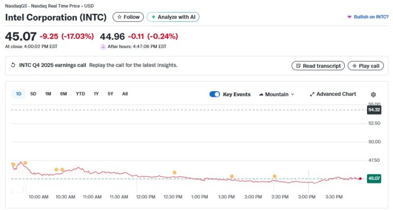 23일(현지 시각) 뉴욕증시에서 인텔은 17.03% 폭락한 45.07달러를 기록했다.