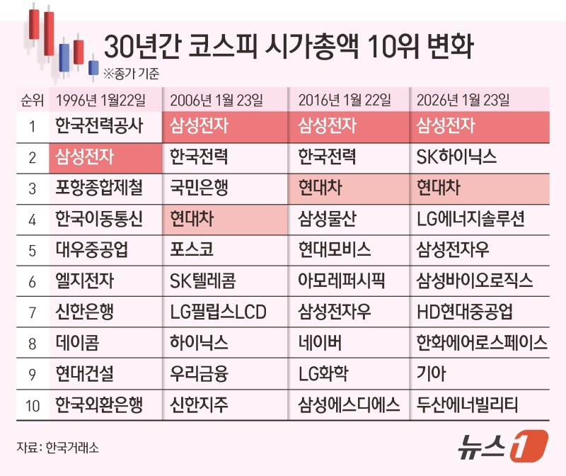 지난 30년간 코스피 시가총액 상위 10위 기업의 변화를 살펴본 결과, 이 기간 내내 순위권을 지켜온 기업은 삼성전자가 유일했다.