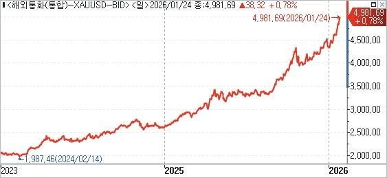 금 가격도 랠리를 지속하며 사상 최초로 온스당 5000달러선 돌파를 눈앞에 뒀다.