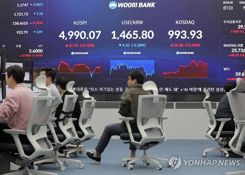 25일 금융정보서비스업체인 연합인포맥스와 한국거래소에 따르면 지난 23일 코스피는 전주(16일 종가) 대비 149.33포인트(3.08%) 오른 4,990.05에 장을 마쳤다.