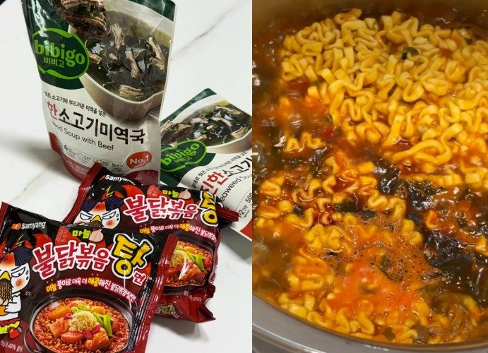 (서울=뉴스1) 박혜연 기자 = CJ제일제당의 비비고 미역국과 삼양식품의 불닭볶음탕면을 같이 끓여먹는 '미역 불닭볶음탕면' 조리법이 사회관계망서비스(SNS)를 중심으로 인기를 끌면서 각 제품 수요가 폭증하고 있다.