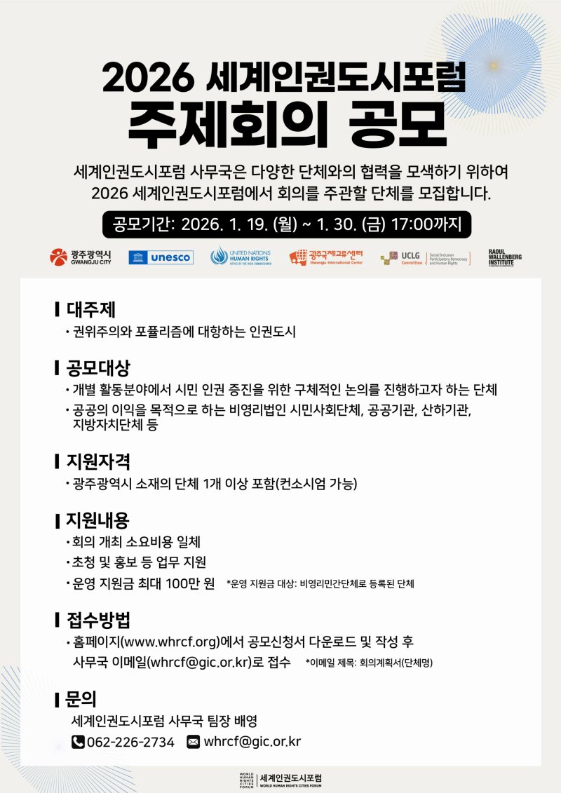 시 관계자는 "세계인권도시포럼은 전 세계 도시들이 연대해 다양한 인권 문제를 논의하고 해결책을 모색하는 대표적인 국제 인권 플랫폼"이라며 "시민사회단체의 적극적인 참여를 통해 인권 의제가 확산되고 실질적인 정책으로 이어지길 기대한다"고 말했다.