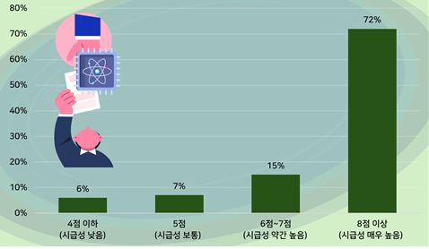 기술 발전 가속으로 업무 환경이 변화하는 가운데 근로 시간의 유연화 필요성이 높다고 보는 경우는 80%(매우 높음 59%·약간 높음 21%)로 나타났다. 직무·성과 중심 임금체계 개편 역시 필요하다는 응답이 80%(매우 높음 56%·약간 높음 24%)이었다.