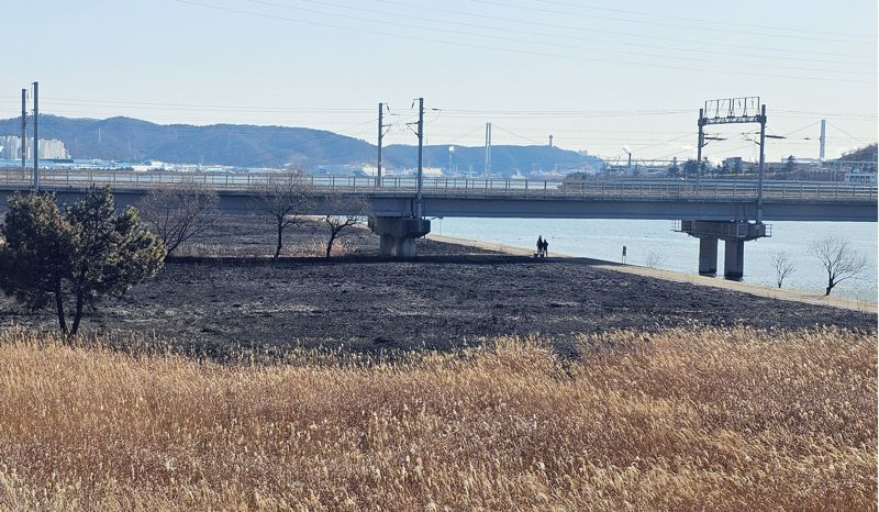 【파이낸셜뉴스 울산=최수상 기자】철새와 수달 등 태화강을 찾는 희귀 동식물의 보금자리 역할을 해오고 있는 울산 태화강 물억새밭이 원인을 알 수 없는 화재로 상당한 면적이 소실돼 안타까움을 주고 있다.