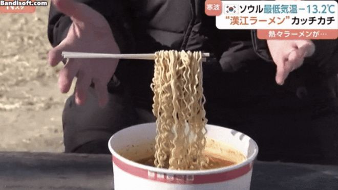 지난 22일 일본 TBS 뉴스 ‘N스타’는 일본 열도를 덮친 최장기 한파 소식을 전하며 한강 라면을 얼리는 장면을 보도했다.