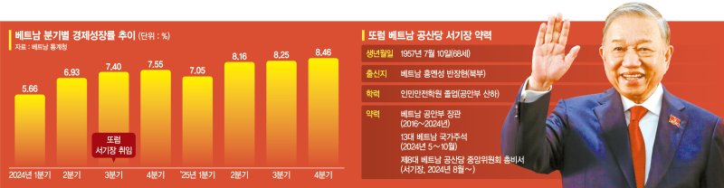 밀접한 한·베 관계도 더 돈독해질 전망이다. 럼 서기장은 지난해 이재명 정부가 출범하자마자 첫 국빈으로 방한했다. 이 대통령의 연내 답방이 확실시 되는 상황에서 럼 서기장의 연임은 양국 관계를 더욱 확고히 할 것이란 기대감이 높아지고 있다.