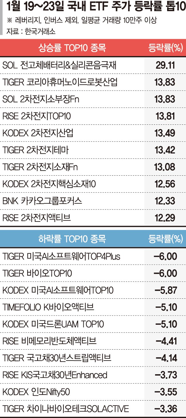 국내 상장지수펀드(ETF) 시장에서 전고체 배터리와 이차전지 테마가 강세를 보였다. 차세대 배터리 기술과 소재주를 중심으로 매수세가 유입되며 상승률 상위권을 휩쓴 반면, 미국 인공지능(AI) 소프트웨어와 바이오 업종은 조정을 받았다.