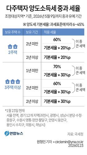 이재명 대통령은 SNS를 통해 5월 9일 종료 예정인 다주택자 양도소득세 중과 유예 조치를 연장하지 않겠다는 입장을 분명히 했다. 23일 "연장을 전혀 고려하지 않고 있다"고 밝힌 데 이어 25일에는 "'재연장하는 법 개정을 또 하겠지'라고 생각했다면 그게 오산"이라며 논란에 쐐기를 박았다.