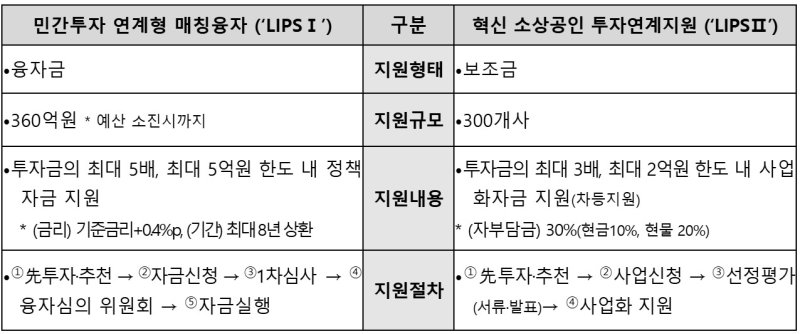 LIPS는 성장 가능성이 높은 소상공인의 신제품 개발 및 사업 고도화 등에 필요한 자금을 지원하는 민간투자 연계형 육성사업이다. '민간투자연계형 매칭융자(LIPSⅠ)'와 '혁신 소상공인 투자연계지원(LIPSⅡ)'으로 구성됐다. 민간 운영사 추천을 받은 소상공인은 LIPSⅠ으로 투자금의 최대 5배(5억원 한도)까지 정책자금(직접대출) 또는 LIPSⅡ로 최대 3배(2억원 한도)까지 사업화 자금을 지원받을 수 있다.