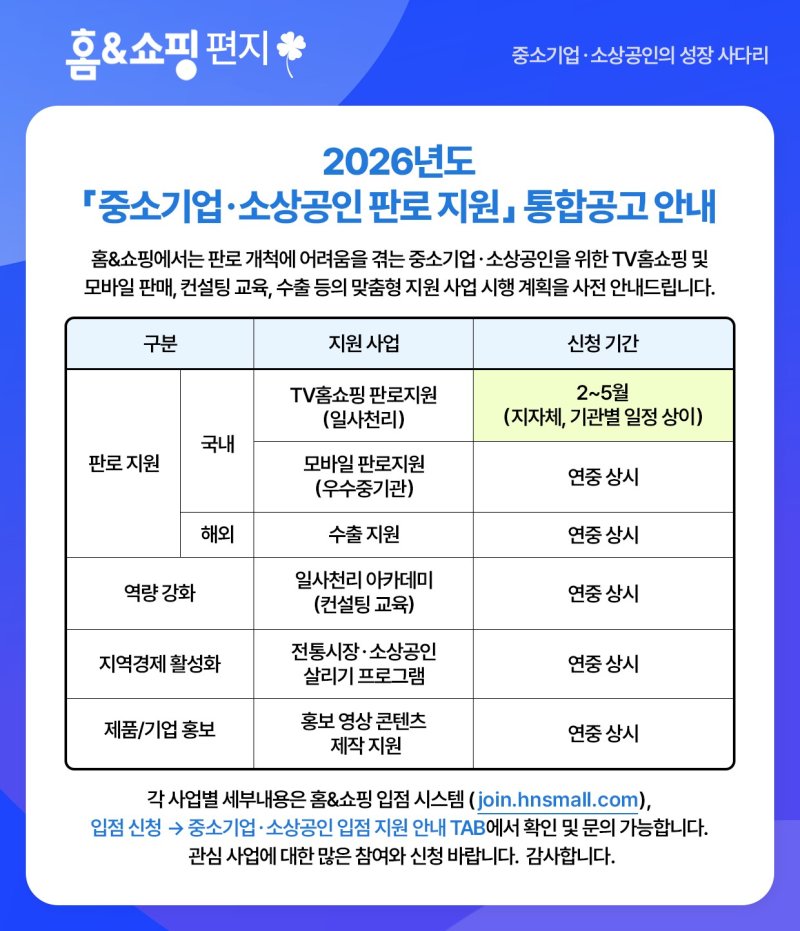 홈앤쇼핑은 '2026년도 중소기업·소상공인 판로지원 통합 공고'를 사전 안내하고 TV홈쇼핑과 모바일, 수출까지 연계한 맞춤형 지원에 나선다고 26일 밝혔다.