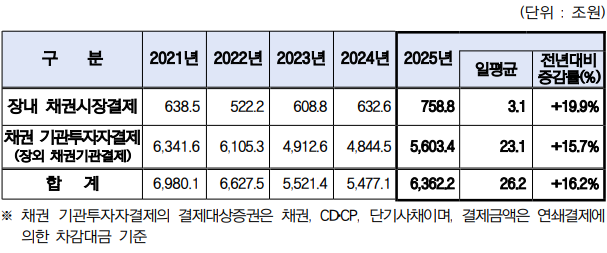 [파이낸셜뉴스] 한국예탁결제원은 2025년 예탁결제원을 통한 채권결제대금 총액이 6362조2000억원으로 집계됐다고 26일 밝혔다. 전년(5477조1000억원) 대비 16.2% 증가한 규모다. 일평균 채권결제대금은 26조2000억원으로 전년 대비 16.2% 늘어났다.