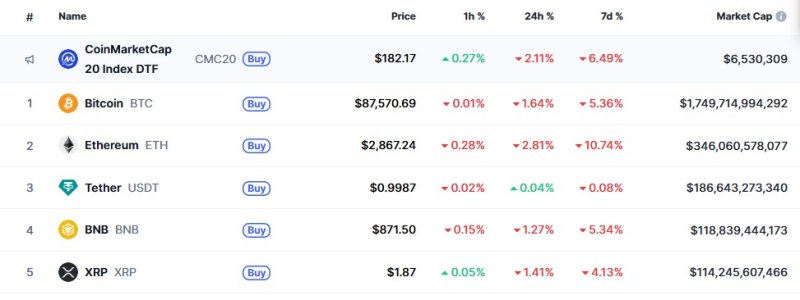 26일 오전 11시 40분 현재 글로벌 코인 시황 중계사이트 코인마켓캡에서 비트코인은 24시간 전보다 1.64% 하락한 8만7570달러를 기록하고 있다.