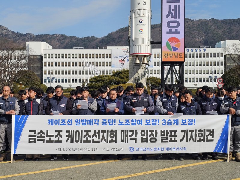 금속노조 경남지부 케이조선지회는 26일 경남도청 앞에서 회견을 열어 "노조 참여 보장 없는 일방 매각 추진을 거부한다"고 밝혔다.