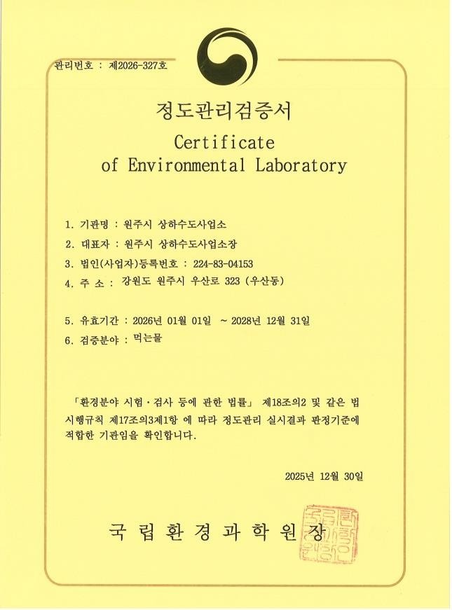 원주시는 도내 지자체 가운데 유일하게 먹는물 검사기관으로 지정·운영 중이며, 이번 검증서 획득을 통해 먹는물 분석 분야에서의 기술력과 공신력을 국가에서 공식적으로 인정받는 성과를 거뒀다.