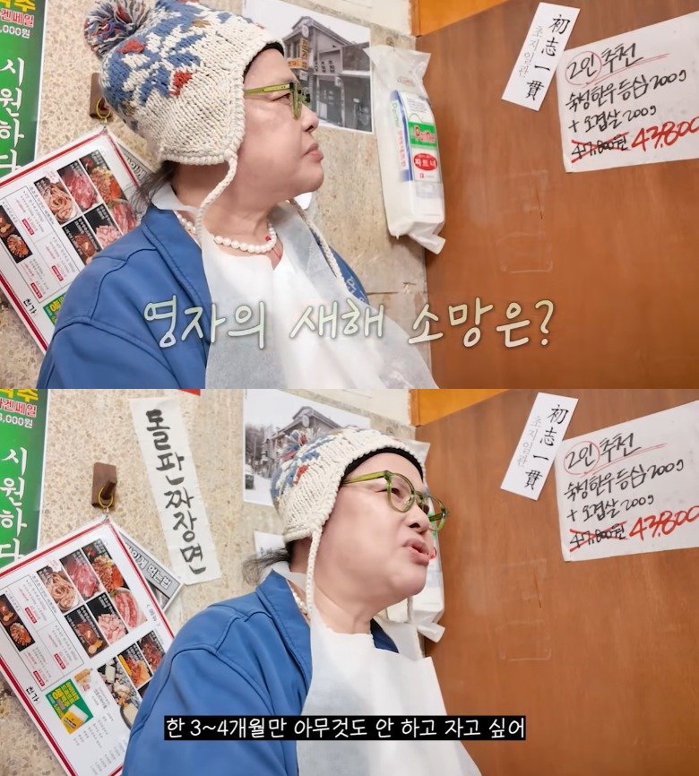 이영자는 새해 소망을 묻는 말에 "나는 그냥 한 3, 4개월 뭐 아무것도 아니고 자고 싶어. 봄 잠 자듯이"라고 말했다.