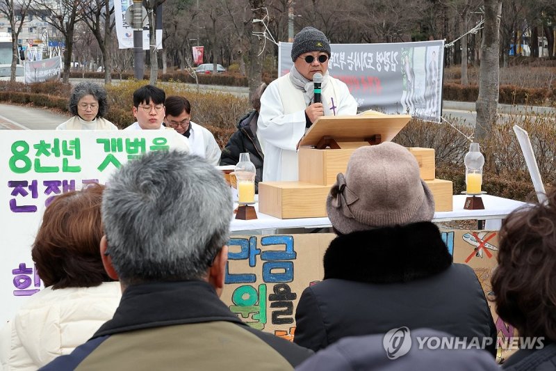 (전주=연합뉴스) 나보배 기자 = 천주교정의구현 전주교구사제단(이하 사제단)이 매주 월요일 전북도청 앞에서 '새만금국제공항 건설 중단 및 생태계 복원 기원 미사'를 개최한다.
