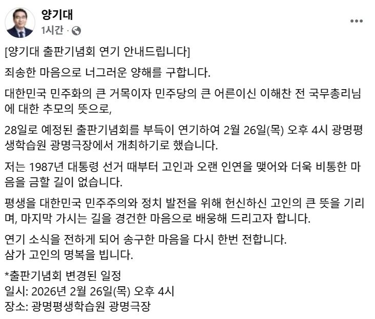 양 전 의원은 26일 자신의 사회관계망서비스(SNS)를 통해 "죄송한 마음으로 너그러운 양해를 구한다"며 "고인의 큰 뜻을 기리기 위해 출판기념회를 연기하고, 2월 26일 오후 4시 광명평생학습원 광명극장에서 개최하기로 했다"고 밝혔다.
