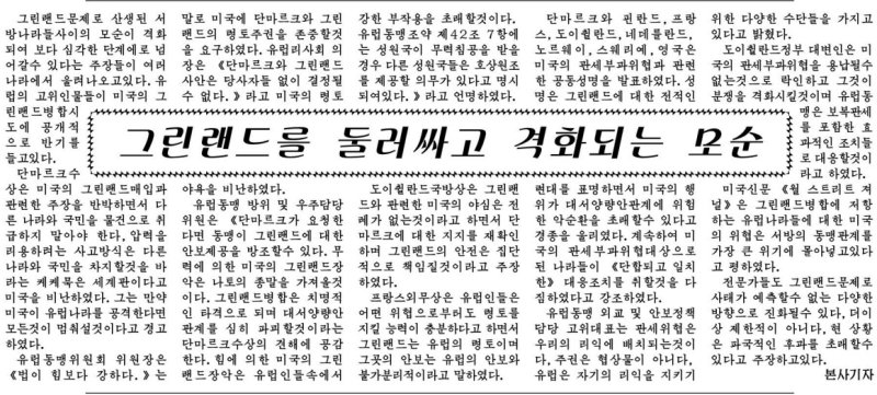 노동당 기관지 노동신문은 지난 25일 "그린란드 문제로 산생된 서방 나라들 사이의 모순이 격화돼 보다 심각한 단계로 넘어갈 수 있다는 주장들이 여러 나라에서 울려나오고 있다"며 "유럽의 고위 인물들이 미국의 그린란드 병합 시도에 공개적으로 반기를 들고 있다"라고 보도했다.