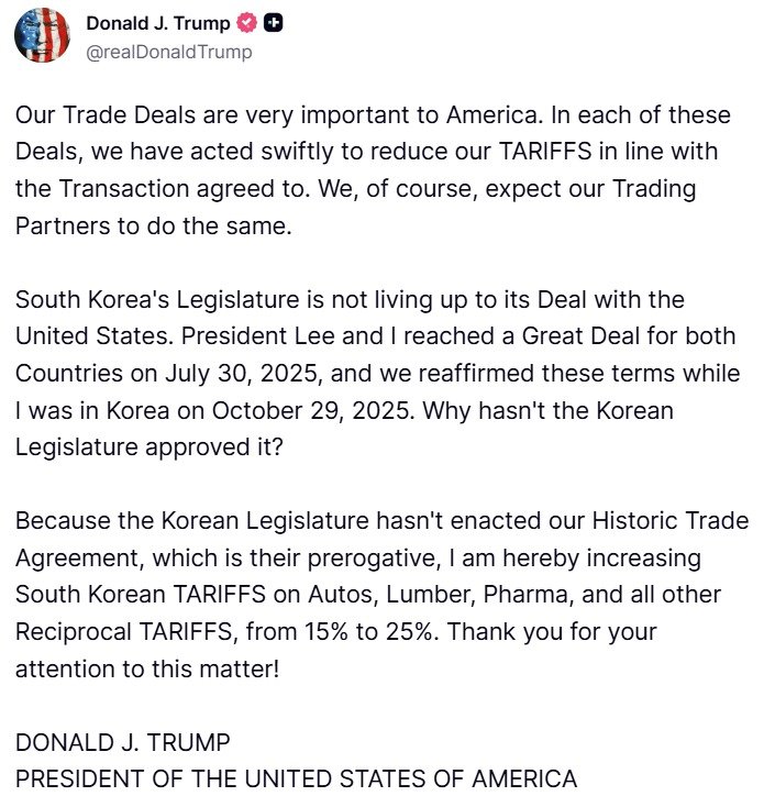 한국 국회가 자신들의 권한인 역사적인 무역협정을 입법화(enact)하지 않았기에, 저는 한국에 대한 자동차, 목재, 의약품 및 다른 모든 상호관세를 15%에서 25%로 인상합니다. 이 문제에 관심을 가져주셔서 감사드립니다!