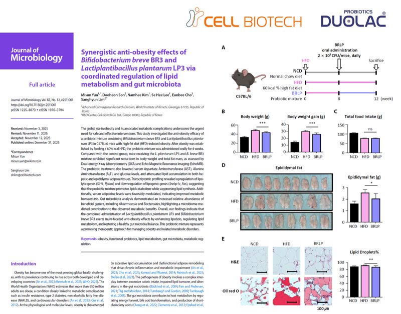 쎌바이오텍 R&D센터 관계자는 "듀오락 CBT 유산균이 장내 미생물 환경 개선을 기반으로 체지방 감소와 대사 기능 개선에 기여할 수 있음을 과학적으로 입증한 사례"라며 "약물 중심 치료의 한계를 보완할 수 있는 안전하고 지속 가능한 비만 관리 전략으로서 마이크로바이옴 기반 솔루션의 가능성을 제시했다는 점에서 의미가 크다"고 설명했다.