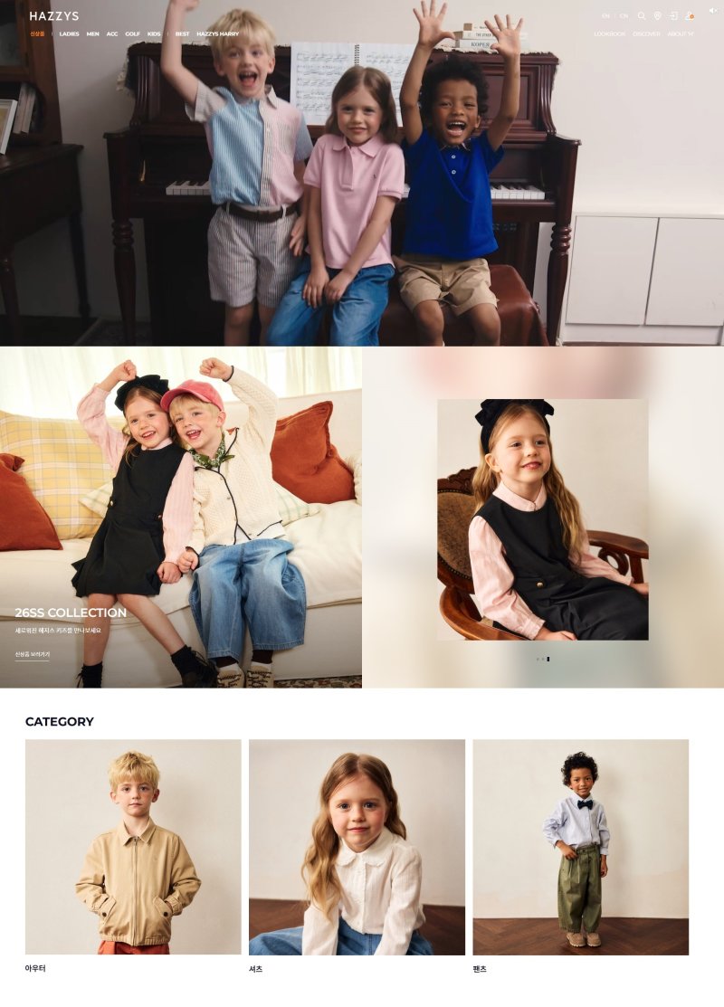 헤지스 키즈 공식 홈페이지는 헤지스닷컴 내 성인 라인과 동일한 브랜드 환경 안에서 키즈 컬렉션을 자연스럽게 탐색할 수 있도록 설계됐다.