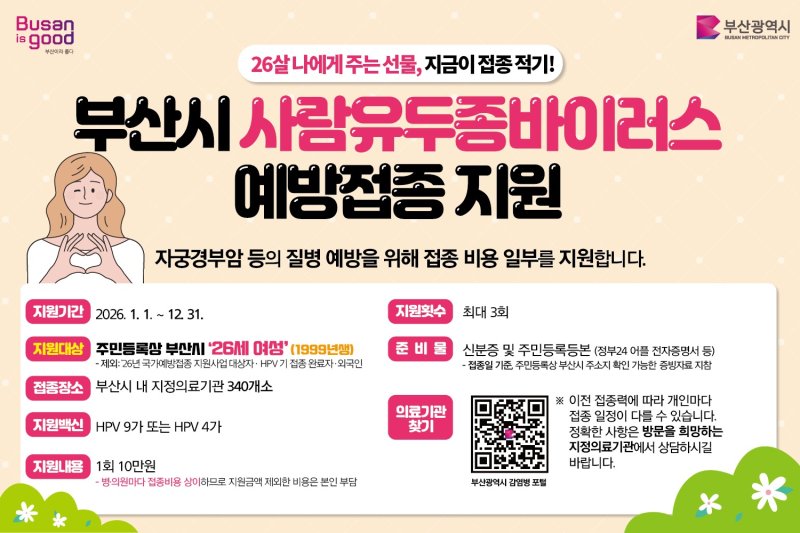 시는 올해 주민등록상 부산에 거주하는 26세 여성(1999년생)을 대상으로 HPV 예방접종 비용 일부를 지원한다고 27일 밝혔다.