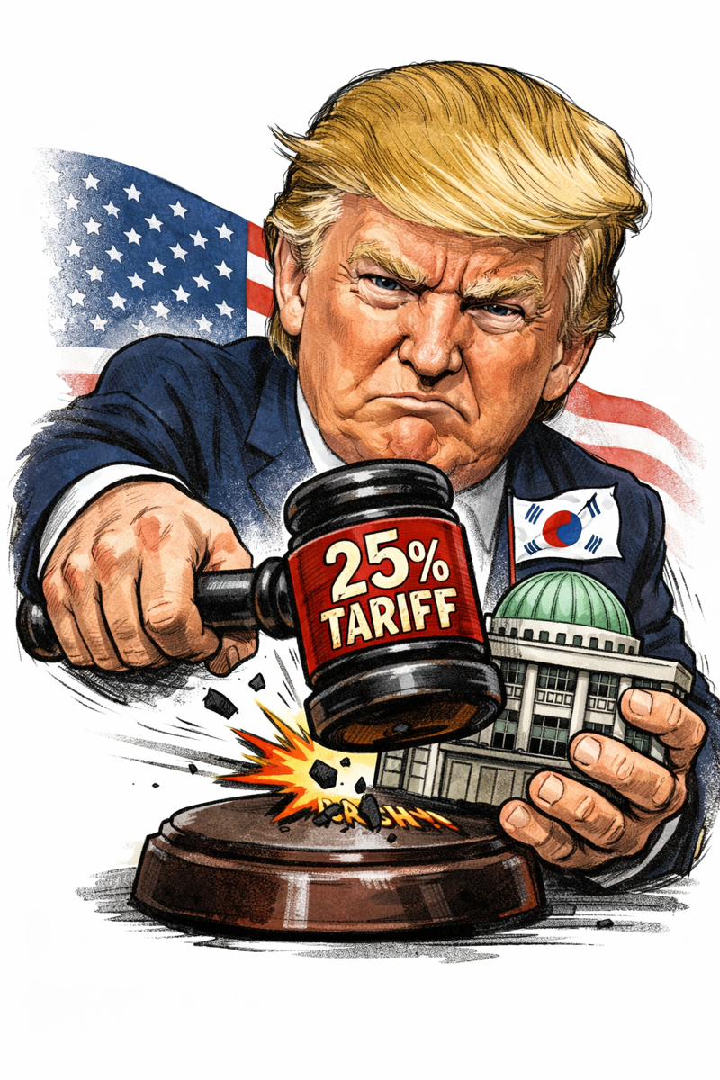 도널드 트럼프 미국 대통령은 26일(현지시간) '한국 국회의 비준 지연'을 명분 삼아 한국산 제품에 대한 관세를 25%로 다시 인상하겠다고 밝혔다.