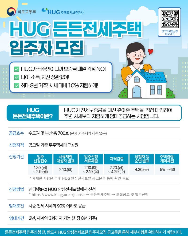 윤명규 HUG 사장직무대행은 "이번 제9차 든든전세주택 입주자 모집공고에도 많은 관심을 부탁한다"며 "올해는 공급 규모를 더욱 늘리고 품질관리도 강화해 청년, 신혼부부 등 무주택 가구의 주거 안정을 지원하겠다"고 밝혔다.